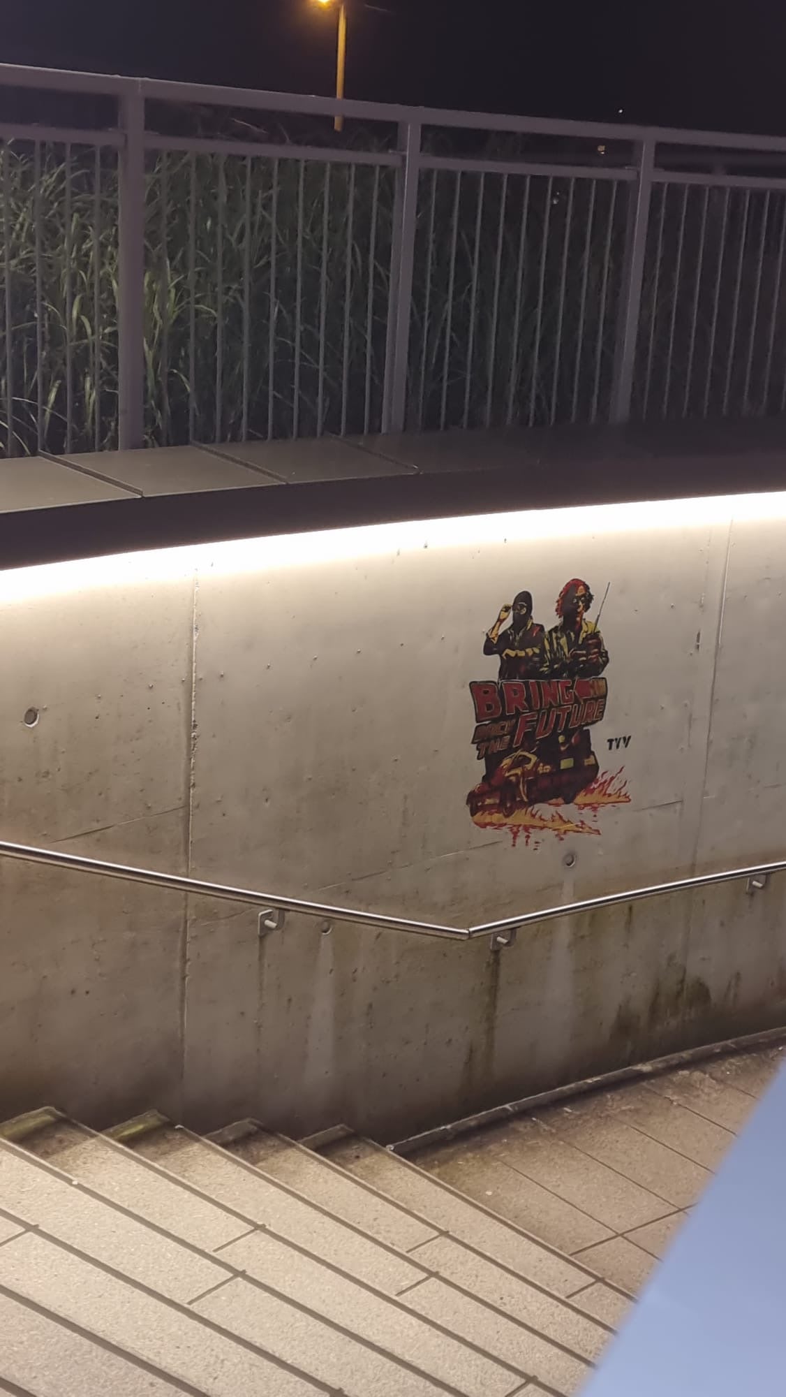 Et satirisk kunstverk som blander nostalgien fra Back to the Future-universet med en skarp politisk kommentar til vår tid. Originalen ble sprayet ved bybanestoppet til Haukeland sykehus i Bergen, og markerer at det i år er 40 år siden Marty McFly og Doc Brown først dro på tidsreise i 1985. Denne gangen sendes de tilbake for å rette opp i vår nåværende dystre tidslinje – en fremtid som minner mistenkelig om når Biff fant almanakken med alle fremtidige sportsresultater og urettmessig gjorde seg skamrik.