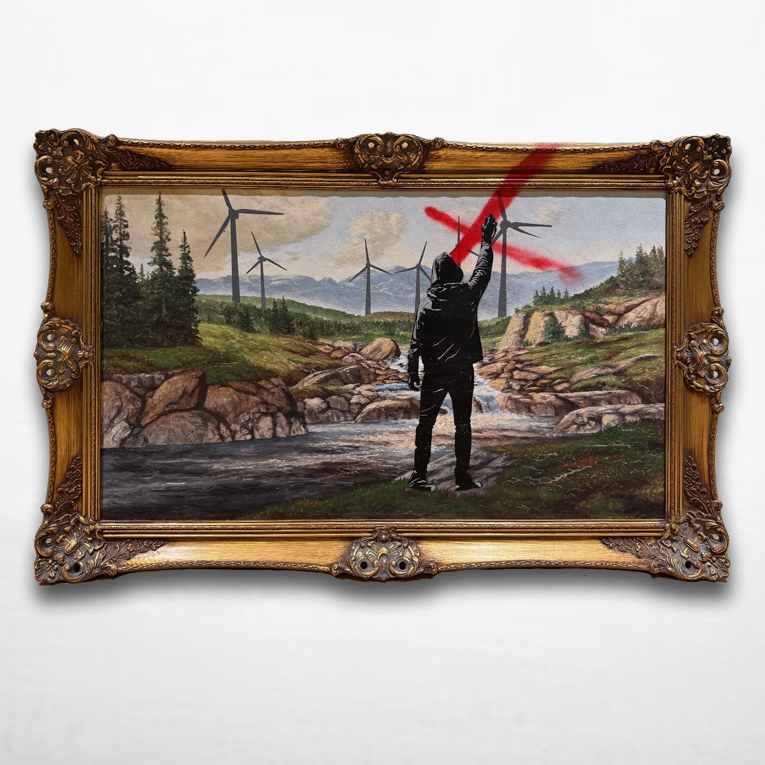 En mann med sprayboks markerer et stort kryss over vindmøller som skjærer gjennom et ellers urørt norsk landskap. Med klassisk oljemaleri som bakteppe invaderer TYV det uberørte maleriet. Om det føles ubehagelig, tenk på hva vi gjør ute i naturen. Vi subsidierer raseringen av vår egen natur under dekke av å være grønne – mens de eneste som gagnes er utenlandske milliardærer.